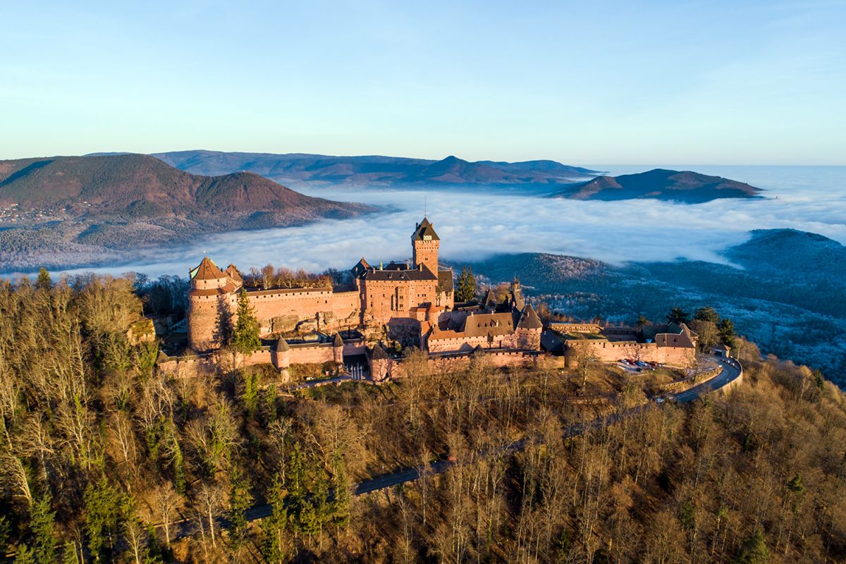 Die Hohkönigsburg wurde im 12. Jht erbaut und hatte berühmte Burgherren, darunter die Familie der Habsburger oder auch der deutsche Kaiser Wilhelm II, der die Burg zu Beginn des 20. Jhts restaurieren und vollständig wiederaufbauen ließ. Die Hohkönigsburg vermittelt das eindrucksvolle Bild einer mittelalterlichen Festung und bietet dazu eine atemberaubende Aussicht auf das Elsass.
