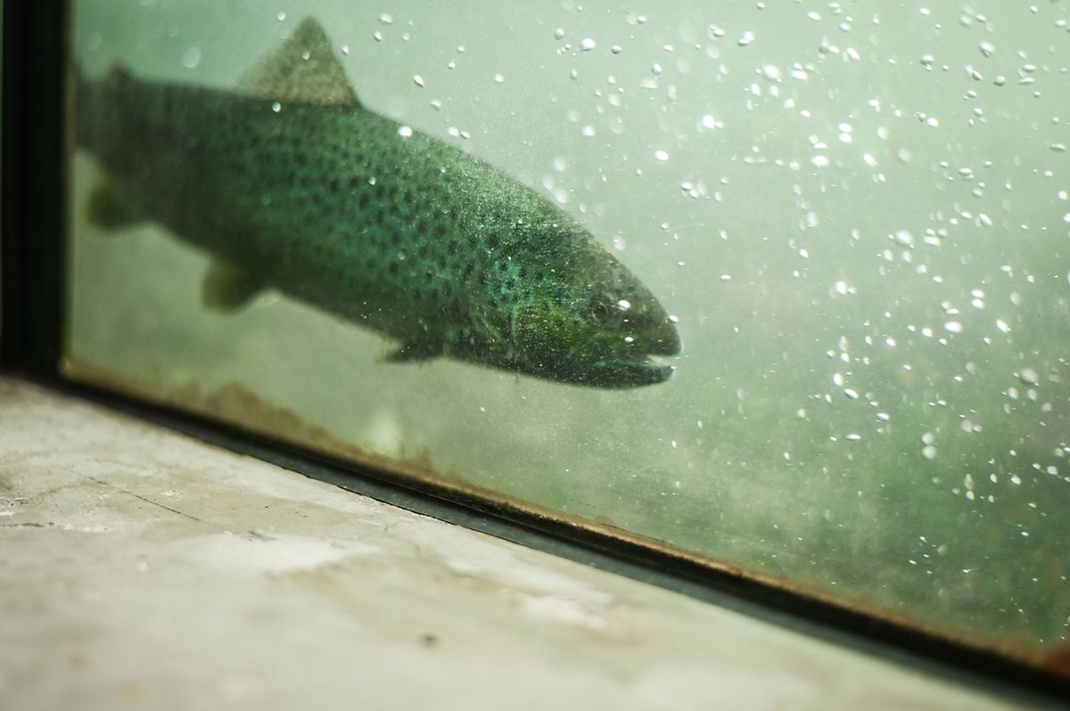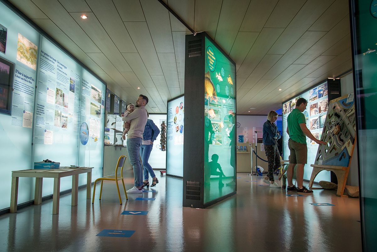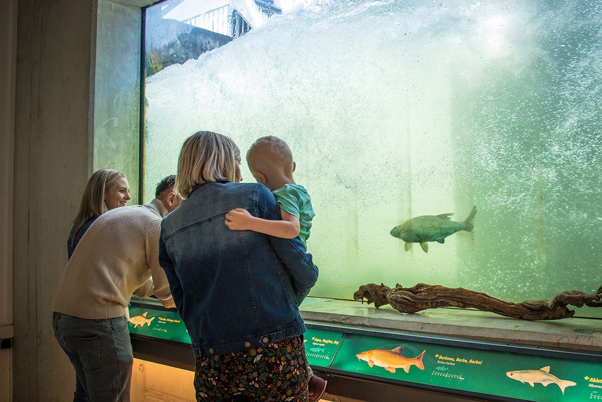 Der Lachs! Was für ein Held! Das halbe Leben verbringt er auf hoher See und schwimmt dann, um abzulaichen, gegen den Strom. So auch im Rhein. Aber auch andere Fische tummeln sich hier: Rotauge, Hecht, Wels ... Über 30 Arten gibt es im Rhein. Mit etwas Glück können im Besucherzentrum Fische in der Fischtreppe („Fischpass“) beobachtet werden. Zudem hat es einen Beobachtungsraum mit drei Glasscheiben für einen besseren Überblick. So viel Wasser! Und wo sind die Fische? Schau mer mal ...