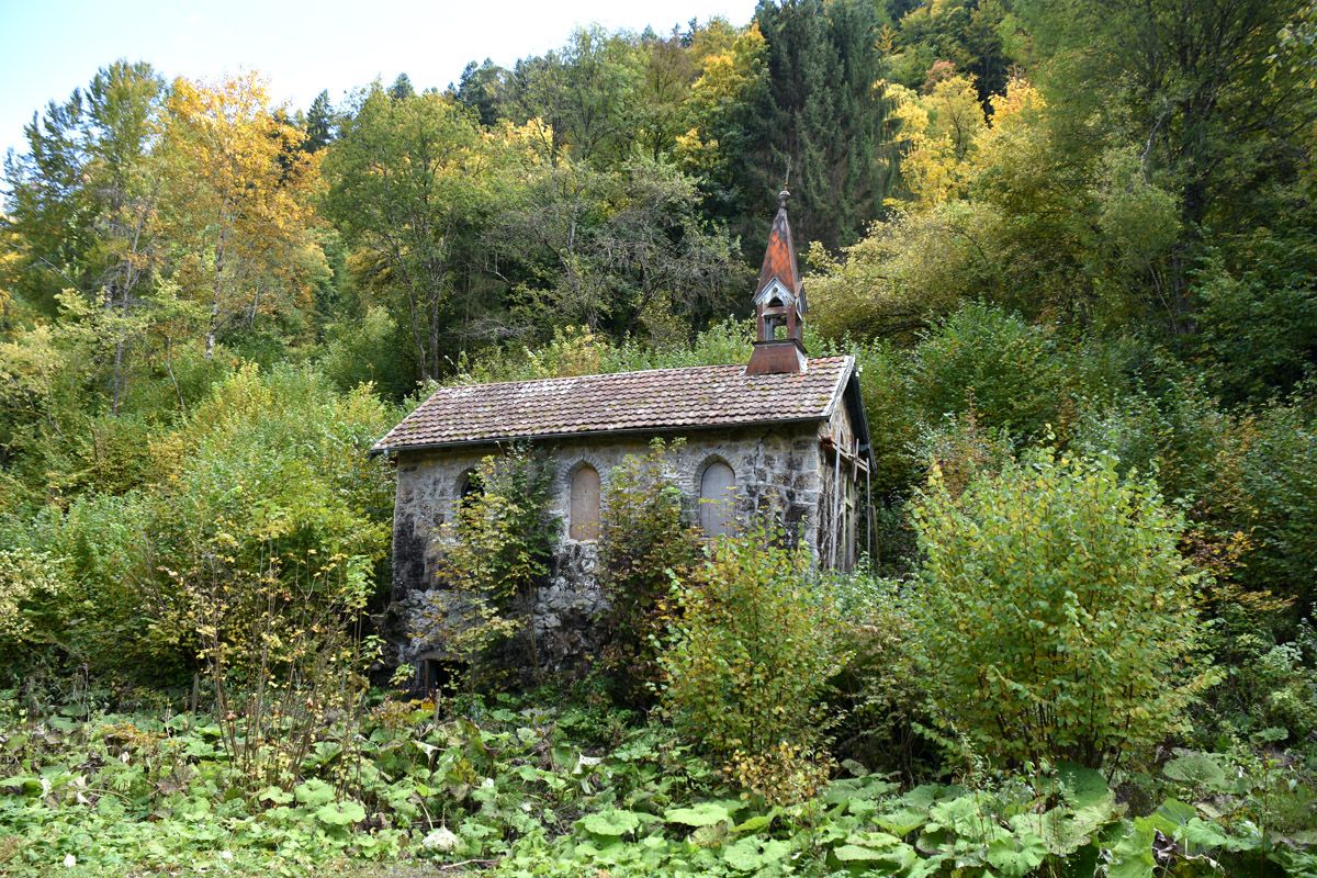 Nach einiger Zeit erreichen wir die verwunschene und vom Verfall gezeichnete Kapelle Bad Boll. Sie weist auf den gleichnamigen ehemaligen Bade- und Erholungsort hin. An das Kurhotel selbst, dass um die Jahrhundertwende dort errichtet wurde, erinnert nur noch die Kapelle und natürlich an die Mineralquelle mit dem Heilwasser. Das Heilwasser wurde schon im 19. Jahrhundert zur Behandlung von Krankheiten eingesetzt. Später wurde der Ort hauptsächlich von Fischern aufgesucht, da das mineralhaltige Wasser besonders für die Fischzucht geeignet ist. Unser erstes Wutachschlucht-Wochenende neigt sich dem Ende und wir sind begeistert. Mit vielen Bildern und Eindrücken machen wir uns auf dem Heimweg.