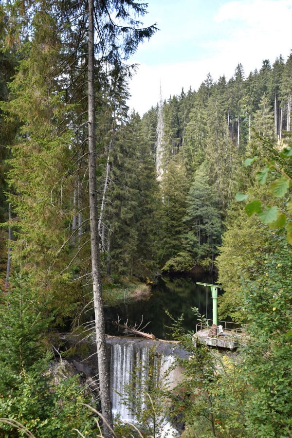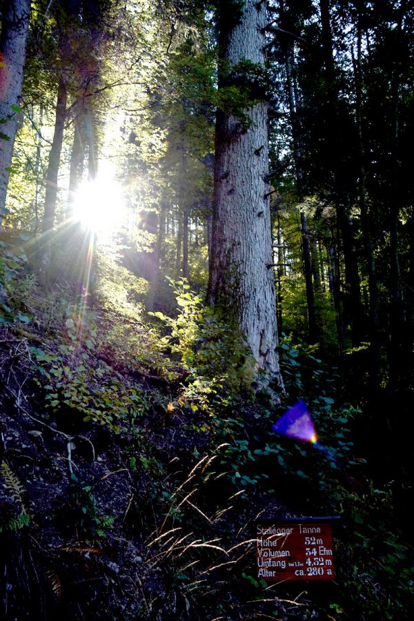 Wir sind neugierig und gespannt auf das was kommt, deshalb setzen wir unseren Weg fort. Die überwältigende Urlandschaft um das Wildflusstal ist für alle Naturliebhaber ein Traum. Das Flussbett naturbelassen, umringt von dichtem Wald. Ab und zu liegt ein umgefallener Baum im Fluss. Darum kümmert sich hier niemand, die Natur wird sich selbst überlassen, wie es sein sollte. Vor uns steht die Stallegger-Tanne mit über 52 m Höhe, 4,52 m Umfang und mit einem Alter von 280 Jahren – das heißt zur Zeit der französischen Revolution 1789 war diese Tanne bereits ein richtiger Baum und schon 50 Jahre alt. Es geht weiter und wir nähern uns dem Wasserkraftwerk Stallegg mit Turbinenhaus und Staumauer. Es gehört zu den ältesten Wasserkraftanlagen in Deutschland und steht unter Denkmalschutz.