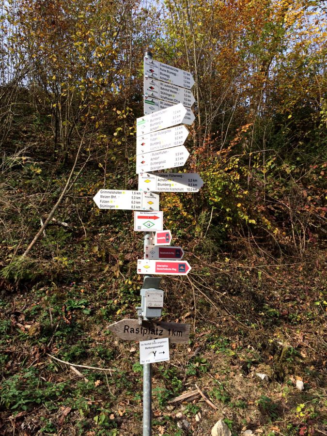 Nun geht es aber wieder abwärts in die Flühen unter einer Brücke der Sauschwänzlebahn hindurch. An einem der zahlreichen Rastplätze genießen wir nach ausgiebigem Vesper eine wohlverdiente Pause bevor wir die restliche Strecke zurücklegen. Rund 24 km sind wir auch an diesem Tag gelaufen. Anstrengend, aber lohnenswert und ein tolles Gefühl. Am Ende unserer Tour entdecken wir noch ein besonderes Schild mit einer persönlichen Botschaft eines Hinterbliebenen an seine Frau oder umgekehrt. Jedenfalls zeigt sich hier, dass der scheinbar sture Schwarzwälder mit all seinen Ecken und Kanten in Wirklichkeit wohl doch ganz sensibel und einfühlsam ist.