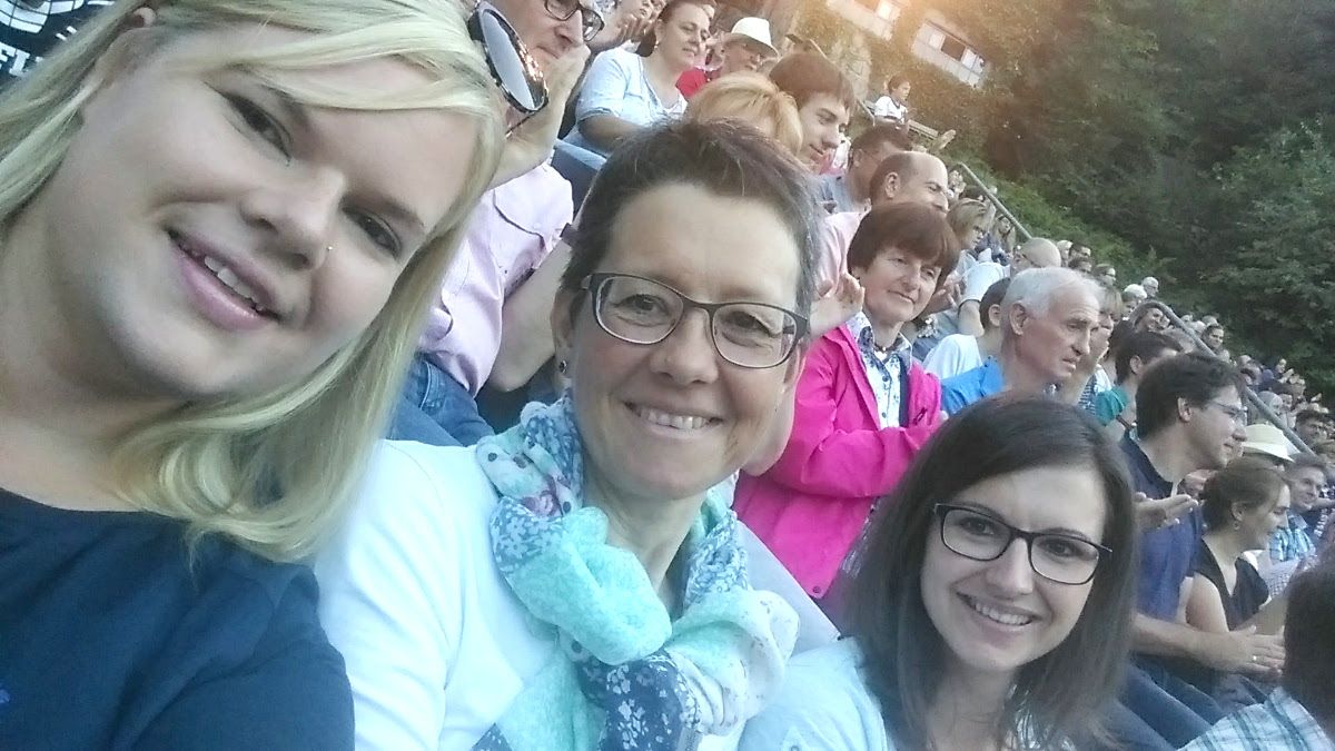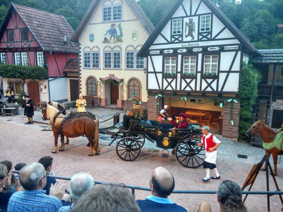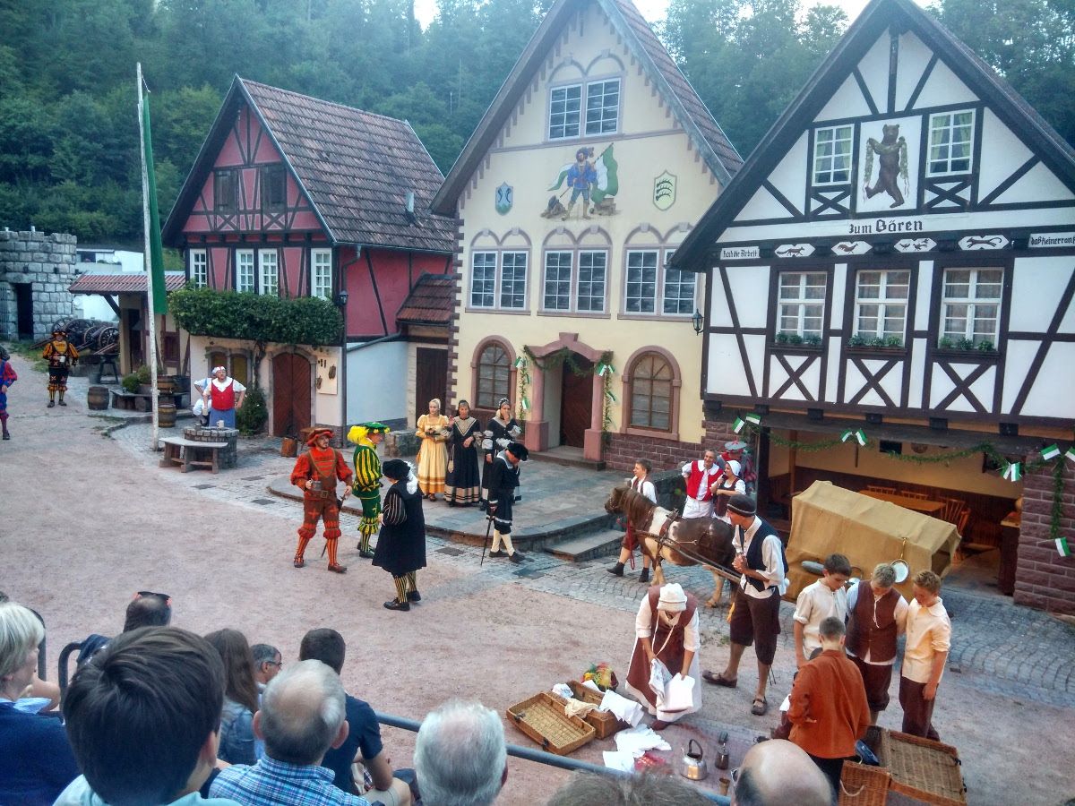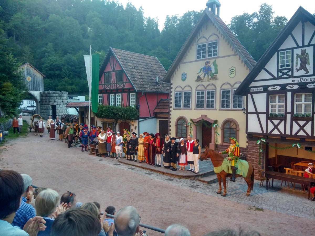 Das muss man einmal gesehen haben, dachten wir uns. Und so machten wir uns einem der Spielabende im Juli bei herrlichem Sommerwetter auf nach Hornberg zur Erwin-Leisinger-Bühne. Und wie begehrt das Freilichttheater bei Touristen und Einheimischen ist, zeigte die voll besetzte Tribüne.