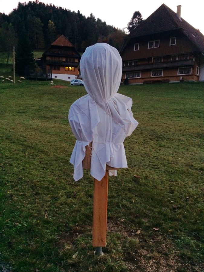 Ich schaue zum Bollenhut-Talwegle und entdecke im Vorbeifahren meinen Chef, der versucht, die Bollenhut-Skulptur in ein weißes Leintuch zu hüllen - und muss lachen.