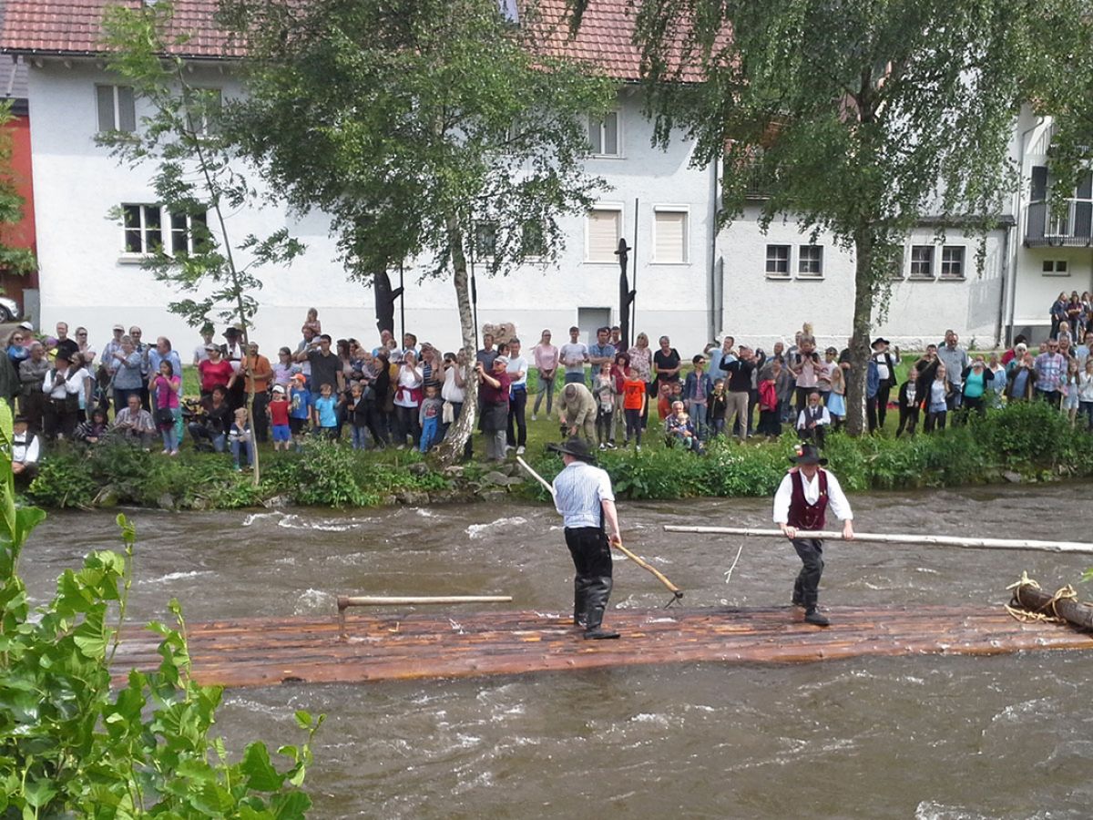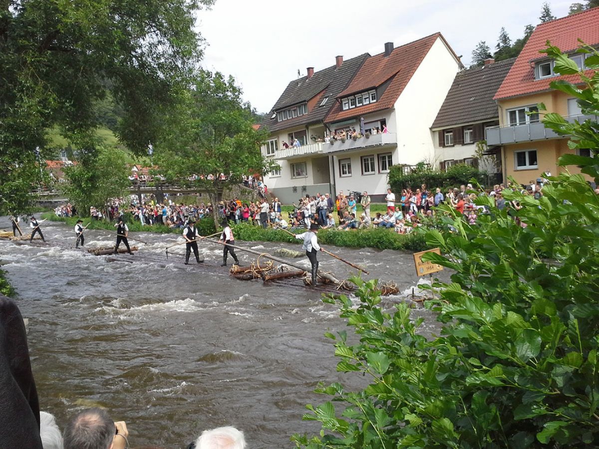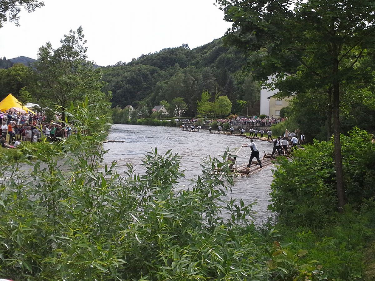 Die "Historische Floßfahrt" auf der Kinzig in Wolfach bedeutete für die Wolfacher Kinzigflößer den historischen Nachbau eines 130 m langen Floßes. Vom Floßhafen schwamm es früher auf dem Wasserweg der Kinzig bis zum Rhein. Der Verkauf des Holzes aus dem Schwarzwald war in dieser Zeit ein unverzichtbarer Wirtschaftszweig für unsere Region. Quelle: Wolfacher Kinzigflößer