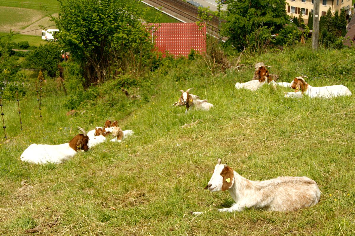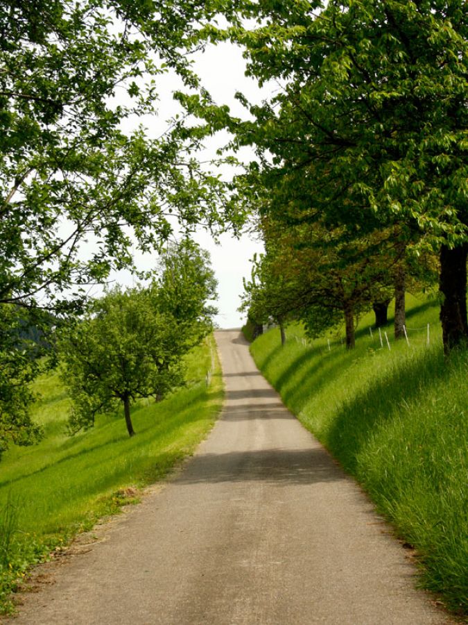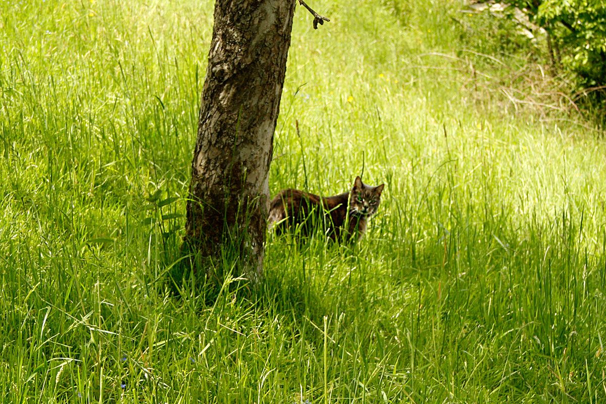 Dann ging's bergaufwärts - Den Schneidweg entlang. Ziemlich steil! Und das bei sonnigem Wetter und 24°C. Hätte ich lieber eine kurze Hose angezogen und eine Wasser-Flasche eingepackt. Eigentlich wollte ich ja auch nur "schnell" den Geocache am Kreuzbühl holen. Jetzt merkte ich schon, dass das nicht ohne etwas "körperliche Anstrengung" ging. Nach einigen Metern begegnete mir eine vorbeilaufende Katze, die unbedingt gestreichelt werden "wollte".