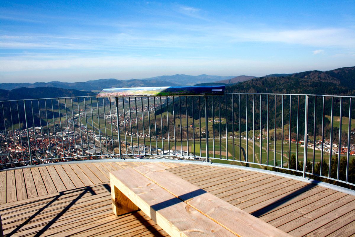 Nachdem ich mich an die leichten Schwankungen und die Höhe gewohnt hatte, konnte ich die Aussicht doch noch genießen und einige tolle Fotos schießen. Was für ein Ausblick! Rundumblick auf das gesamte mittlere Kinzigtal mit den Gemeinden Haslach, Hofstetten, Mühlenbach, Bollenbach, Schnellingen, Hausach, Steinach, Hofstetten, ... Bei klarem Wetter reicht die Sicht scheinbar sogar bis zu den Vogesen im Elsass und zum Feldberg im Schwarzwald. So viel Glück hatten wir an diesem Tag leider nicht.