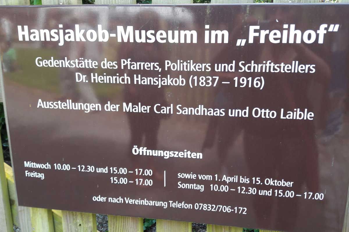 Das Museum wurde im "Freihof", dem Alterruhesitz Heinrich Hansjakobs, untergebacht und bietet einen Einblick in seine Werke als Schriftsteller sowie sein Wirken als Historiker, Publizist und Politiker. Die Einrichtung aus der damaligen Zeit wurde teilweise beibehalten. So kann man neben dem Sterbebett Hansjakobs auch seine Haus-Kapelle betreten. Im Freihof sind außerdem Kunstausstellungen mit Werken des Haslacher Zeichners und Malers Carl Sandhaas (1801-1859) und von dem gebürtigen Haslacher Otto Laible (1898-1962) in den oberen Stockwerken zu finden.