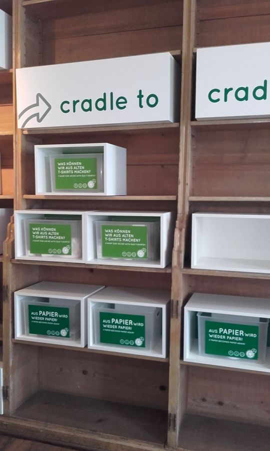 Überall im Museum findet man Boxen, zum Thema Cradle to Cradle (z.B. was können wir aus alten T-Shirts machen).