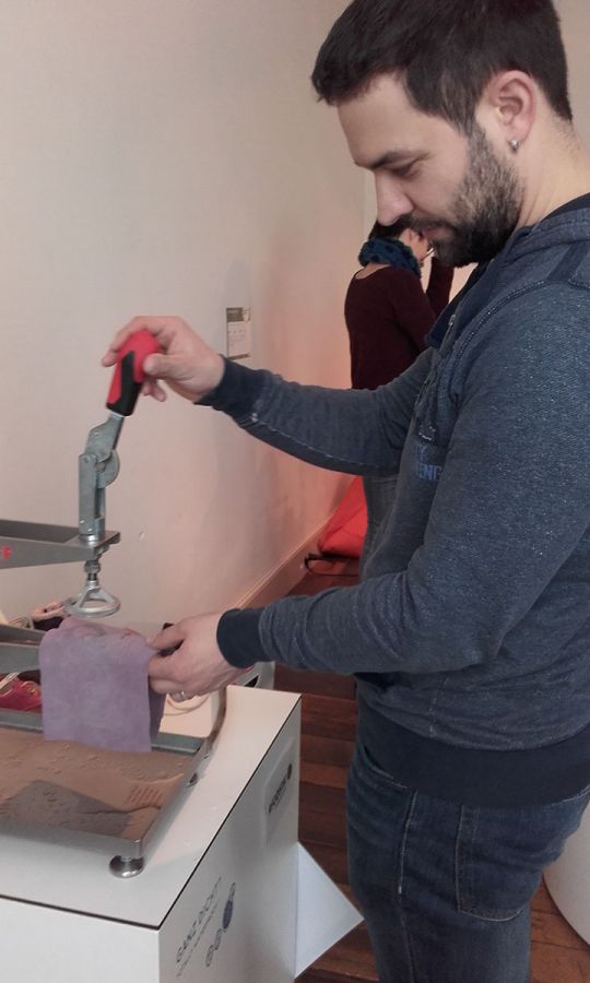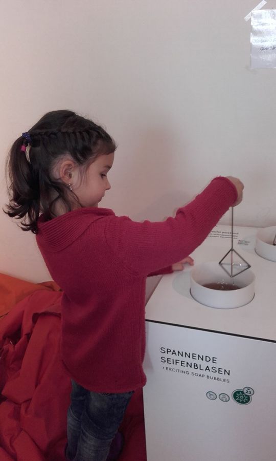 Die Materialien von Ricosta werden unter fachmännischen Vater-Augen auf Durchlässigkeit geprüft, während Hanna eckige Seifenblasen herstellt.