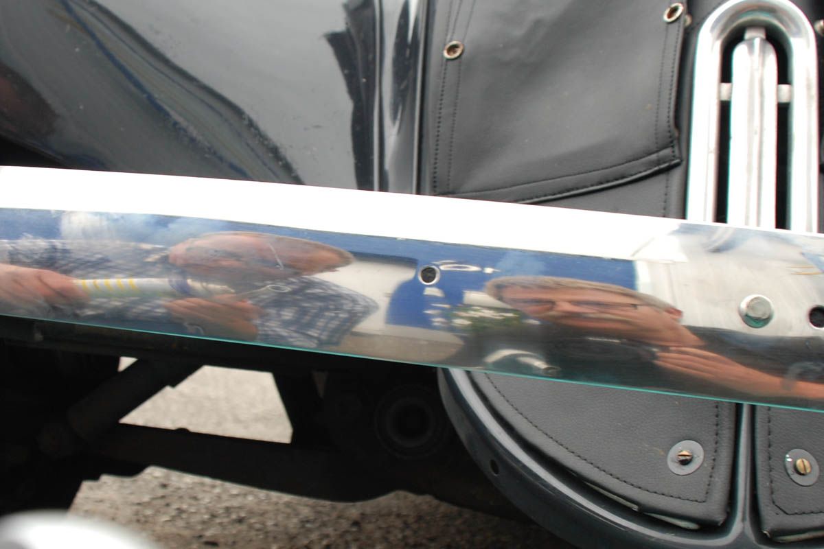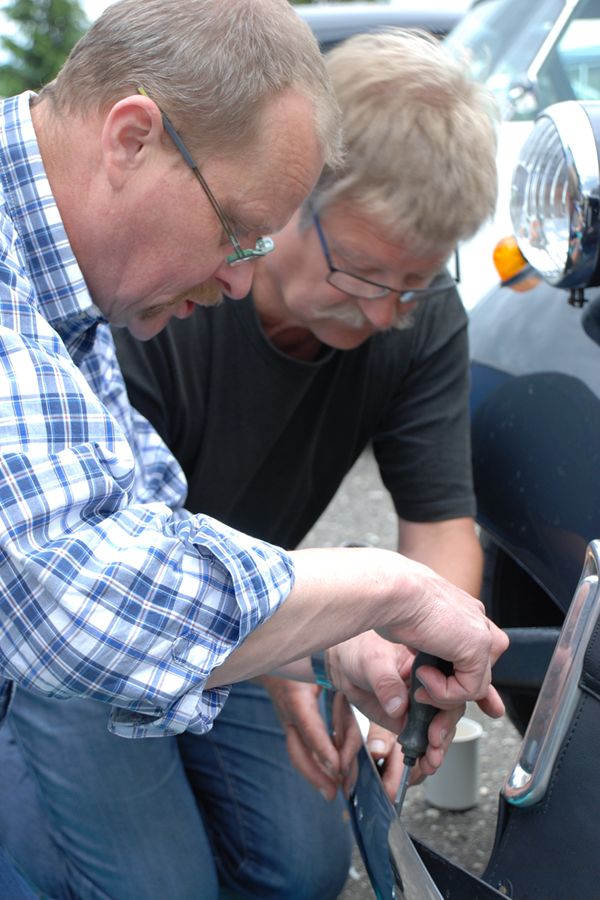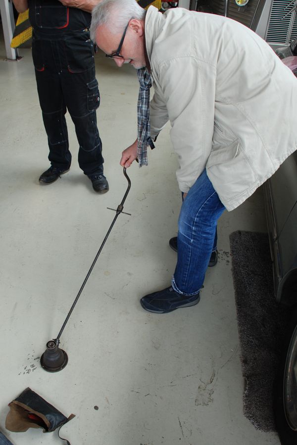 Mein Traction Avant normale 11 B "Luise", Baujahr 1956 bekam vor einigen Wochen von der Werkstatt meines Vertrauens: J.C. neue Marchal-Scheinwerfer. Natürlich mit gelbem Licht um jede Charme-Offensive zukünftig für uns zu entscheiden. Die mit Rost übersäte vordere Stoßstange passte nun wirklich nicht mehr zum charmanten Anblick. Deswegen klare Entscheidung, die alte muss weg. Jürgen Czajkowski besorgte mir eine neue (natürlich Stoßstange) zum Schraubertag - jetzt aus Edelstahl für ewigen Einsatz. Also kurze Begrüßung der anderen, Werkzeug raus und ran ans Werk. Die Schrauben hatte ich vorsorglich einen Tag zuvor mit Rostlöser eingesprüht, so hatte meine kleine Rätsche keinerlei Problem mit dem Lösen der Schrauben. Ich biete eine Original-Stoßstange, 59 Jahre alt, die hat den Quai de Javel schon gesehen, mit viel Patina zum Verkauf, sagen wir 5.000 Euro rief ich in die sich theoretisch fortbildende, aber auch schraubende Gemeinschaft und hielt das verrostete Teil in die Höhe. Staunende Blicke ereichten mich. "In Ordnung, weil ihr es seid, also für 3.500 Euro würde ich mich von dem selteten Stück trennen". Keine Reaktion, sondern nur Gelächter. Gut, akzeptiert, dann versuch ich es halt in 50 Jahren nochmal.