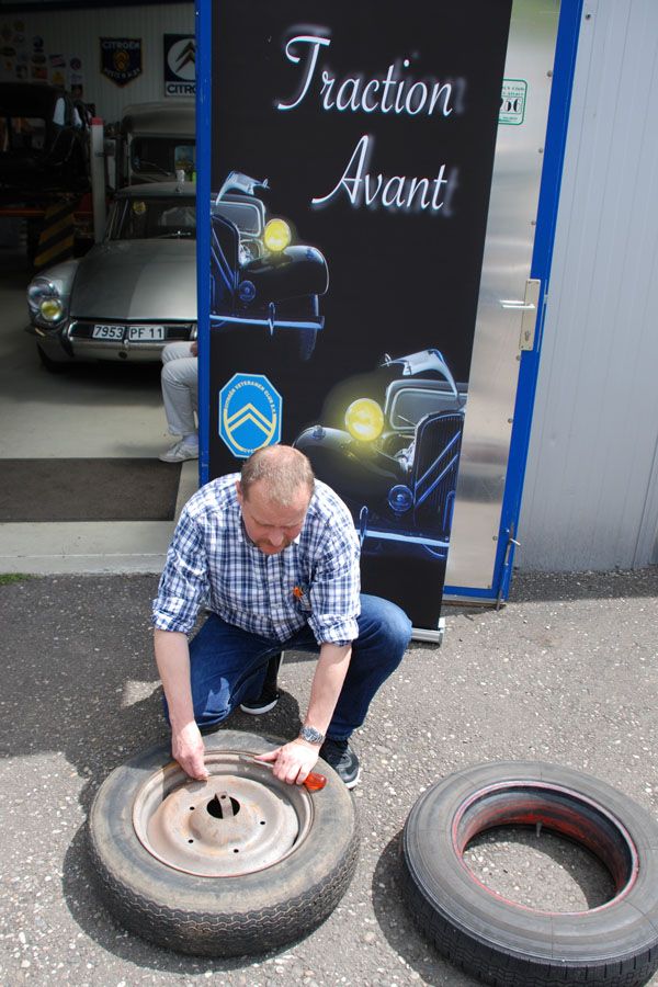 Nachmittags wollte ich die Chance des Schraubertags nützen um meinen uraltes Reserverad mit einem neuen Reifen zu versehen. Ich legte das gute Stück auf den Boden und gab Wolfgang die Ehre, das Ventil zu öffnen und die Original Pariser Luft aus dem Jahre 1956 entweichen zu lassen. Deutlich roch man noch Reste von gitanes mais, gauloises blondes, pastis, presson, petit rouge et, et, et.