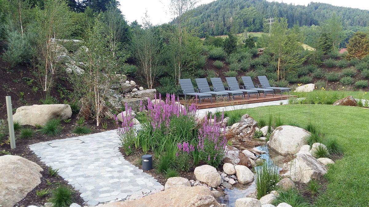 - Panoramasauna, Sanarium mit Farbbeleuchtung sowie ein Saunagarten mit Rundlauf, Bachlauf und Sonnendeck