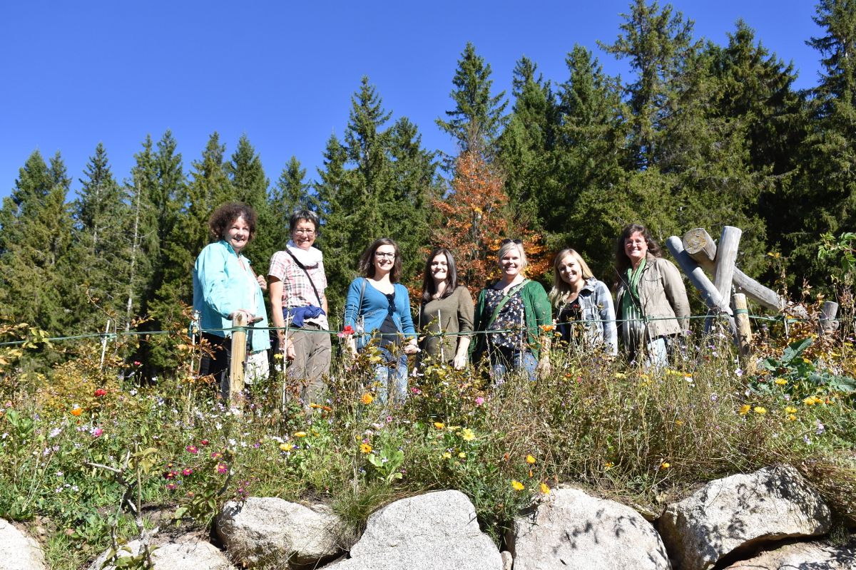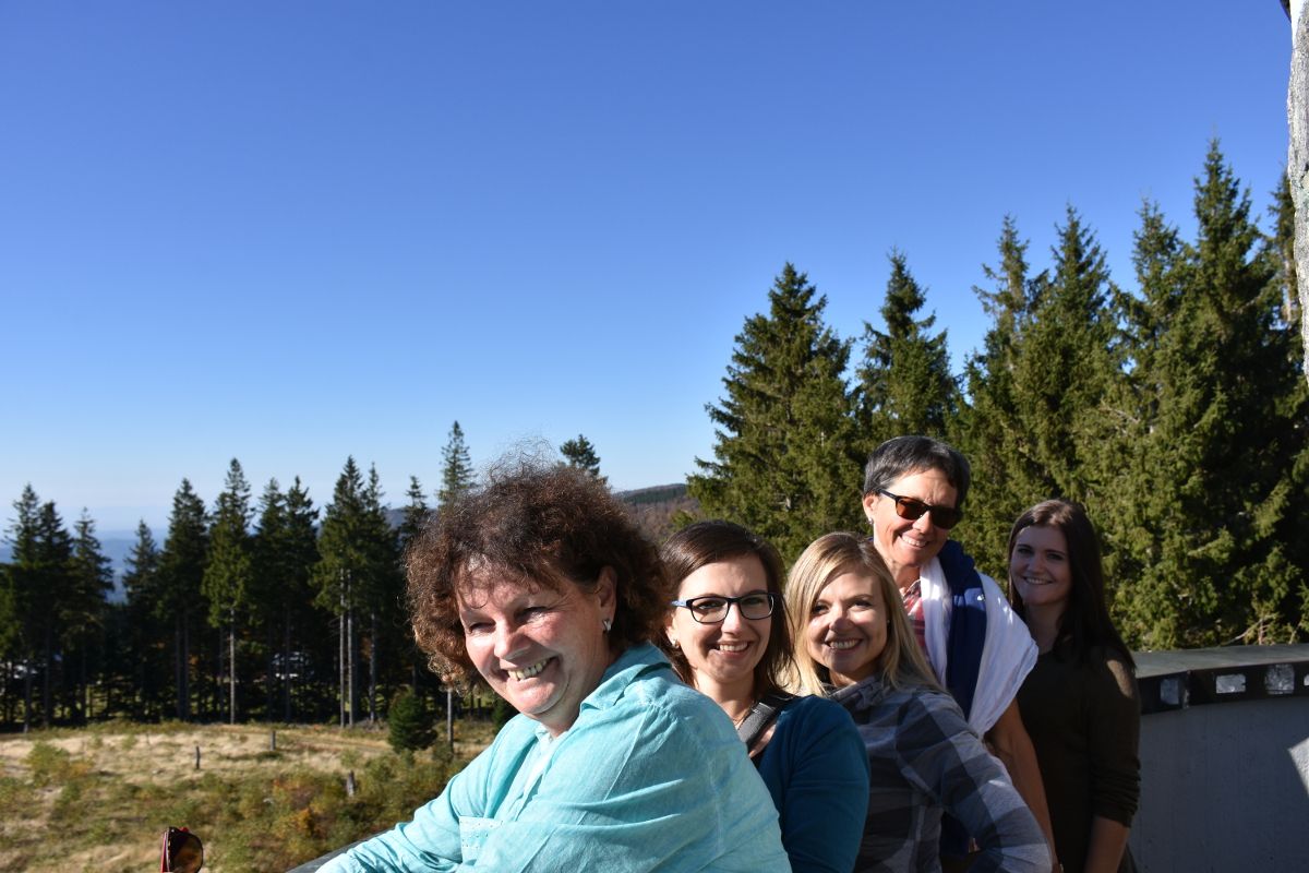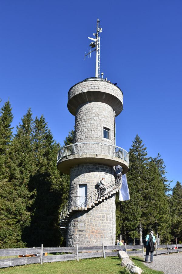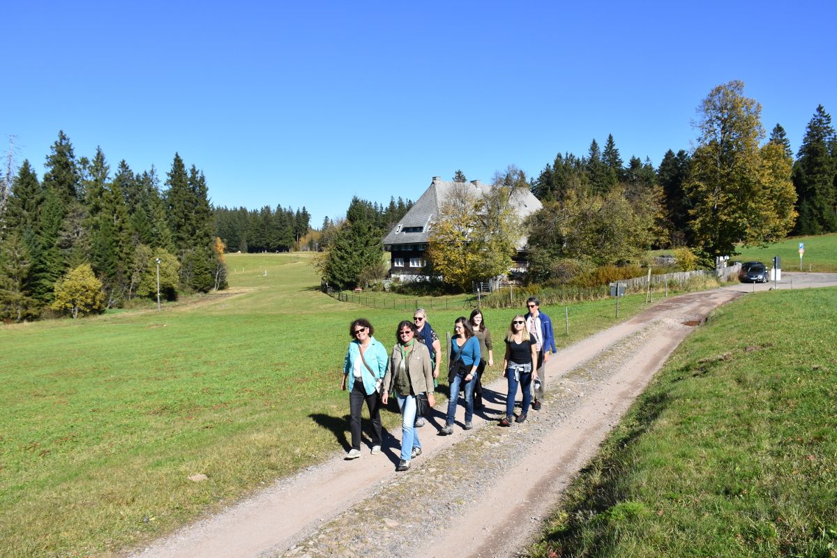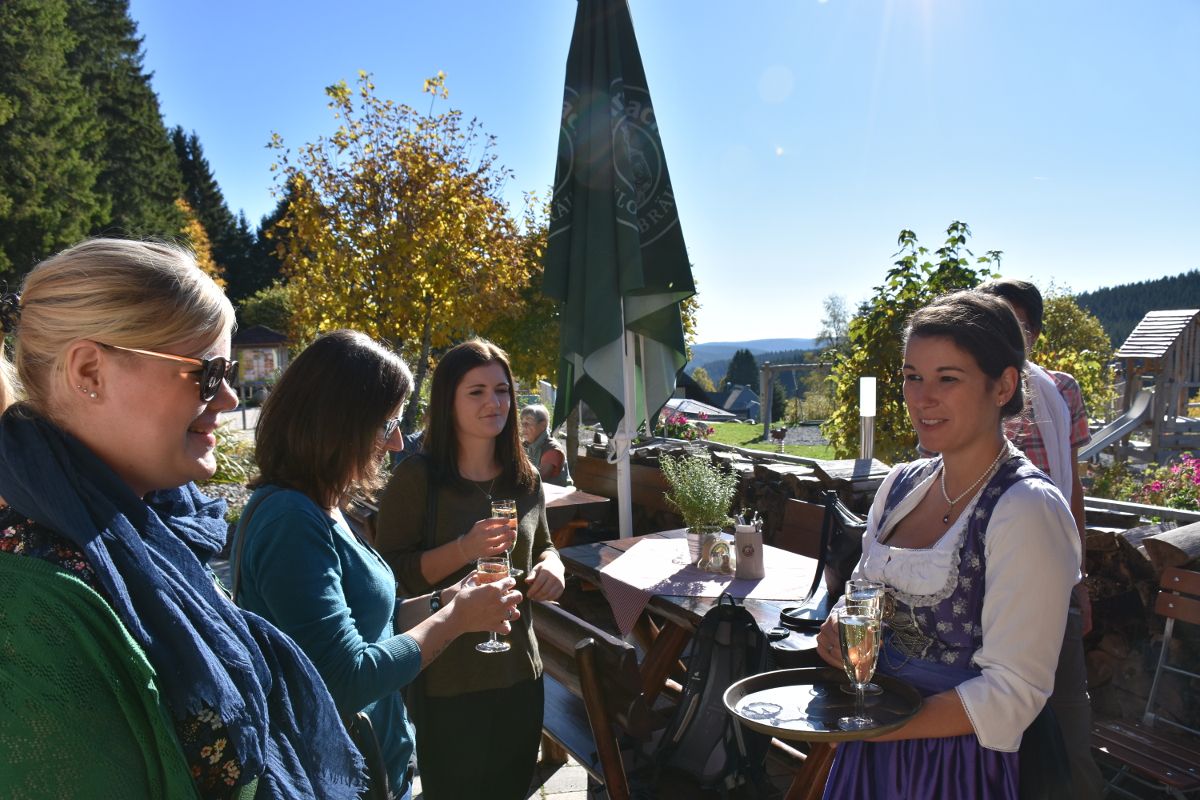 Wir machen es uns nun auf der Sonnenterrasse des Kolmenhofs gemütlich und lassen uns ein leckeres Mittagessen schmecken. Ob fangfrische Schwarzwaldforelle, leckere Maultaschen oder frischer Salat – die Karte des Kolmenhofs lässt keine Wünsche offen. Gut gestärkt, führt uns ein etwa halbstündiger Fußmarsch nun zum Aussichtsturm Brend. Vorher machen wir aber noch einen kurzen Abstecher in die Martinskapelle. Bei unserer Wanderung genießen wir den herbstlich duftenden Wald. Eine kurze Passage wandern wir auf dem mit Blättern bedeckten Westweg bis zum Hochplateau Brend auf 1150 m. ü.NN. Die 127 Stufen des Aussichtsturms nehmen wir gerne in Kauf, denn oben erwartet uns ein atemberaubender Ausblick in Richtung Feldberg und sogar bis zu den Schweizer Alpen. Die Bergkette am Horizont ist mittlerweile in leichten Dunst gehüllt. Wir nehmen uns einige Minuten für diese besondere Aussicht, bevor wir zurück zum Kolmenhof wandern.