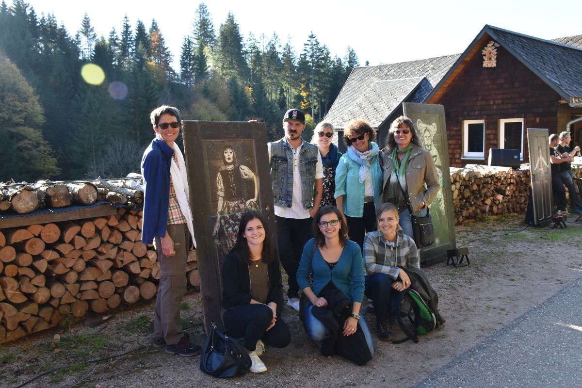 Es ist mittlerweile 16.00 Uhr und wir haben noch einen ganz besonderen Programmpunkt vor uns. Unser nächstes Ziel heißt Hübschental in Gütenbach, nahe Furtwangen. Irgendwo schon mal gehört, denken Sie sich? Ach ja richtig. Hier, im tiefsten Schwarzwald, umgeben von Wäldern und Wiesen, befindet sich das Label Artwood Black Forest von Modedesigner und Künstler Jochen Scherzinger. Heute findet die Ausstellung „Laterne, Laterne – Eine Promenage im Hübschental“ statt. Wir parken am Waldrand und müssen noch einige Schritte einen Waldweg entlang, leicht abwärts gehen. Und hier soll noch ein Haus stehen, denken wir uns? Plötzlich ertönt mystische Musik aus dem Wald. Noch eine Kurve und wir sehen das einsam stehende Haus von Jochen Scherzinger und nun doch zahlreiche Autos. Entlang des Wegs zum Haus, bewundern wir Fotografien auf Leinwänden, Holz oder alten Holztüren, die mit farbigen Lichtern und imposanter Musik in Szene gesetzt werden. Wirklich beeindruckende Arbeiten.