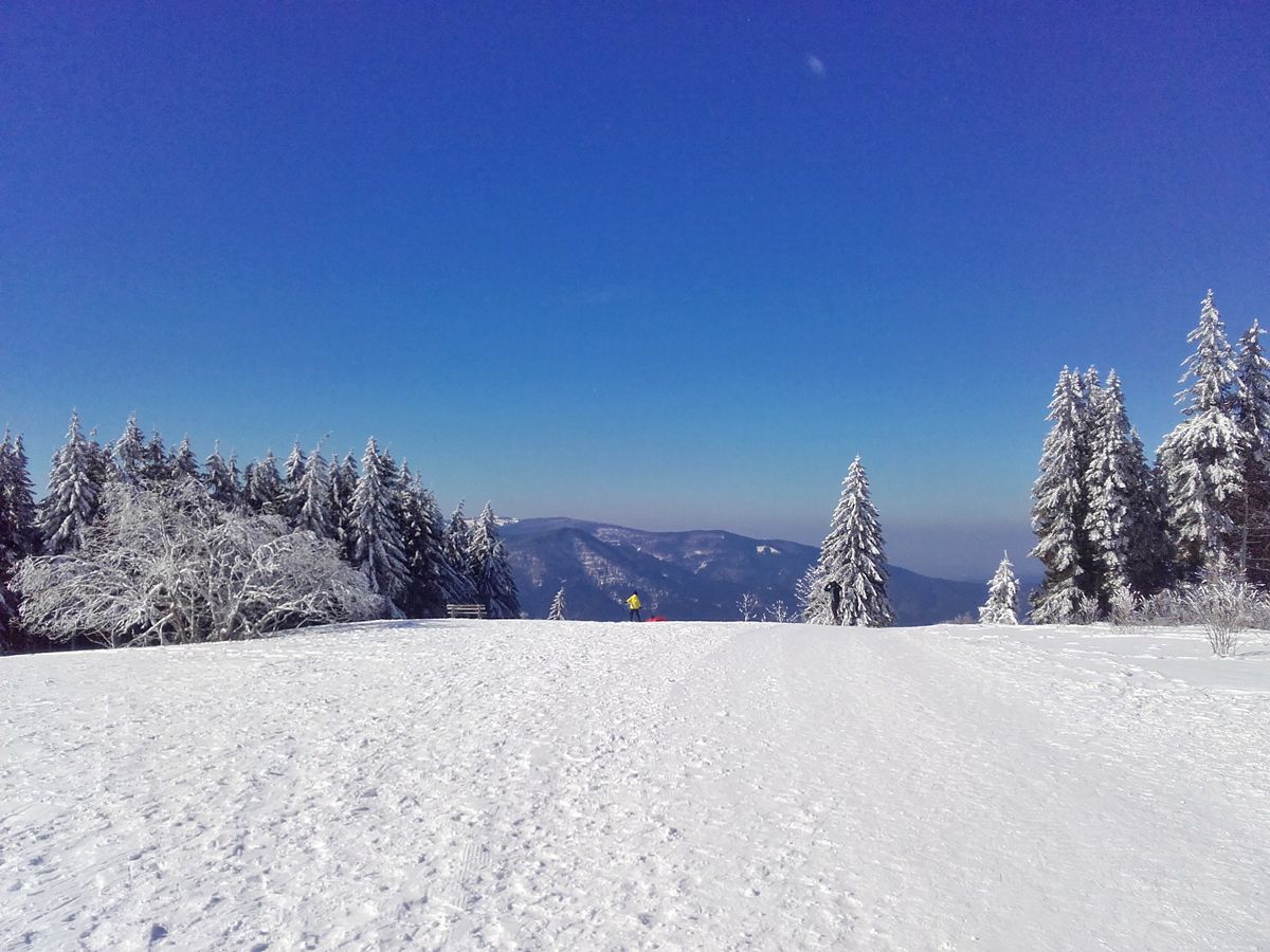 Ich laufe zur Spechtstanne, dann auf die Schänzlerunde, immer durch den Wald bis zur Schwedenschanze. Plötzlich stehe ich auf freier Fläche mit wahnsinns-Blick, eine Schneelandschaft vom Feinsten, Ruhe. Wenn nur diese fiese Ostwind nicht wäre, der einem die Tränen und die Nase fließen lässt … Also weiter, auf langer Schleife zurück zur Spechtstanne, jetzt auf anderem Weg zurück zum Start, unterwegs wieder Aussicht, dieses Mal in die andere Richtung. Beim Auto kurz einen Drink aus der Teekanne und dann noch die Schleife zum Brend, Hinweg durch den Wald, Rückweg nochmals Aussicht. Verschwitzt und glücklich erreiche ich wieder das Auto und habe jetzt nur noch eine offene Entscheidung: Soll ich lieber ein Stück Schwarzwälder Kirschtorte essen im Kolmenhof oder eine Suppe oder ein Vesper?