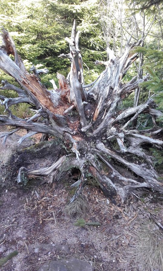 Wir parken direkt beim Lotharpfad auf dem Parkplatz und starten. 1999 wurden auf der Fläche vom Orkan Lothar alle Bäume umgeworfen. Hier entdecken wir tolle Wurzeln, Wurzelteller, die die Phantasie anregen, schiefe Bäume, schöne Aussichtsplattformen und Hochsitze. Mit den Kindern ist dies ein kurzweiliger Fußweg, weil es alle paar Meter etwas zu bestaunen gibt.